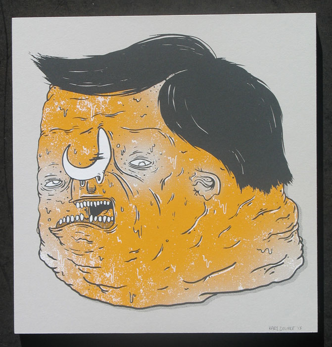 stranger factory puts on an annual halloween show showcasing local, national, and internationally recognized visual artists and designers. several months ago, k was invited to participate in this always intoxicating and delightful group show. since the initial invitation, i have watched him wrack his brain for ideas, then sketch, draw, print, and paint his way to the five pieces he submitted to the show. each piece is very halloween and very karl deuble.