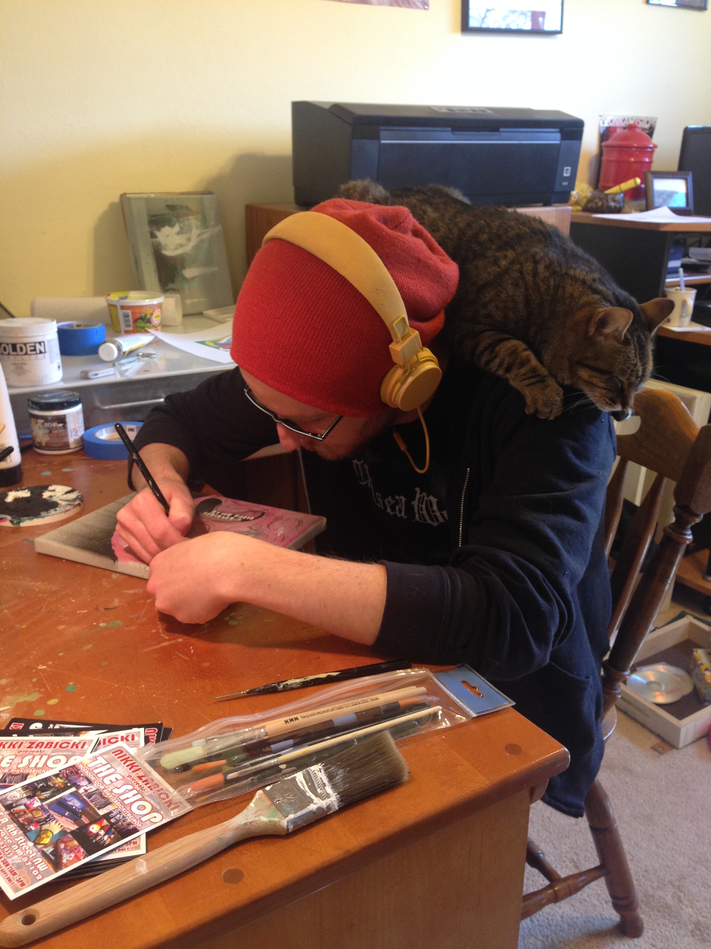 this is what karl has been up to for the past three months…painting for sfxccm with headphones on, while bobbi tries to be as annoying/adorable/in-the-way as possible.
